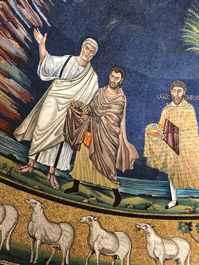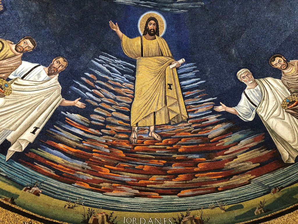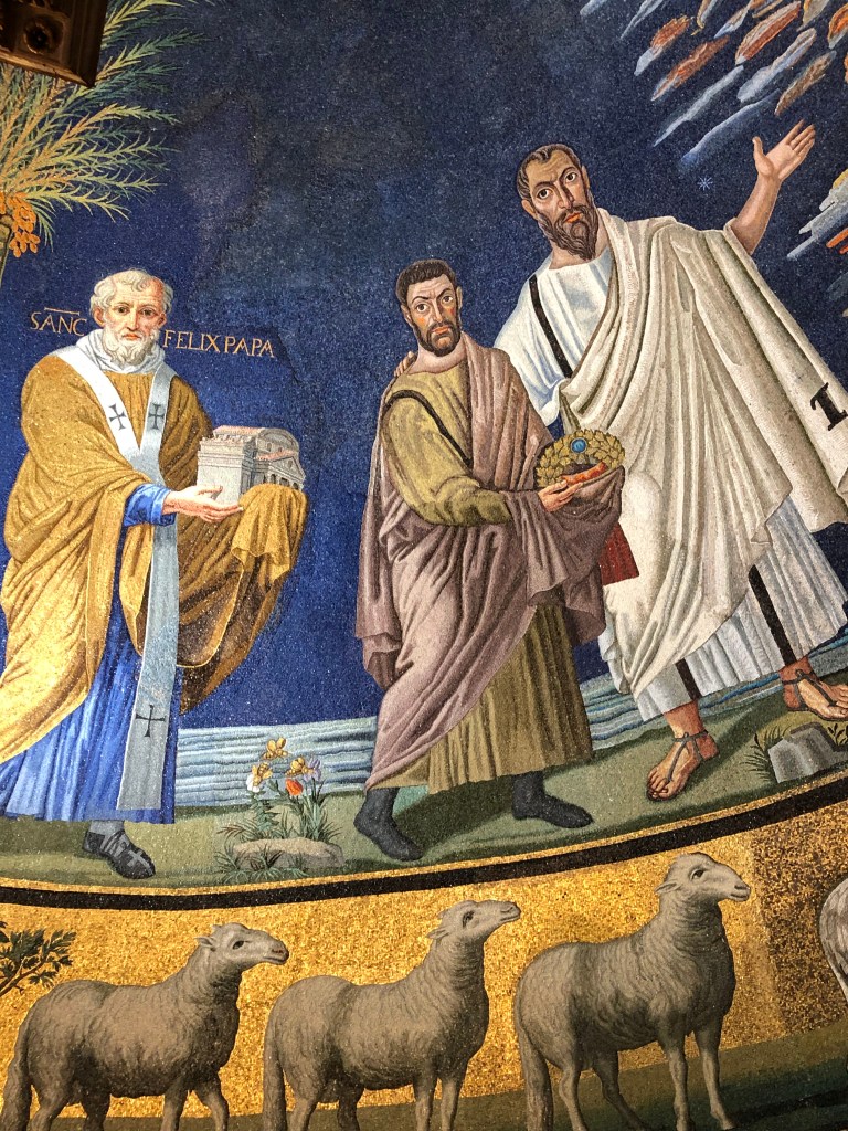 Instead, enjoy Rome’s mosaics, in all their particularity. The urban Pantocrator of Santa Pudenziana, the rather rustic Jesus of San Marco’s (much later) mosaics, the martyrs approaching Christ on their knees in Ss. Nereo e Achilleo (another felicitous substitution in this year’s station liturgy), and, my favorite, Cosmas and Damian–Christ coming in an apocalyptic sky, the saintly physicians holding crowns of martyrdom and guided by Peter and Paul, Pope Felix holding the church he built–and note even his episcopal shoes, in contrast to the sandals of the apostles.