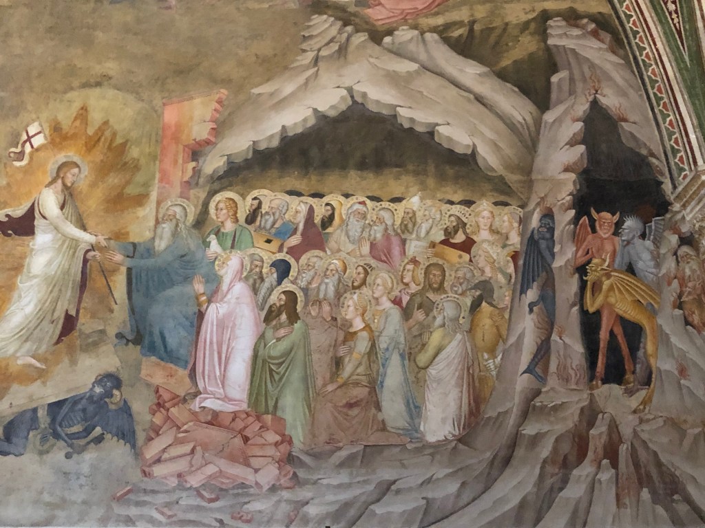 Today’s reading from the Office of Readings put me in mind of the fresco of Christ’s descent into the limbo of the patriarchs in the chapter room of Santa Maria Novella in Florence. Note the demon crushed under the doors of hell at Christ’s feet and the other bewildered devils on the right. (Don’t feel sorry for them.) It’s what the Middle Ages had instead of superhero movies.
