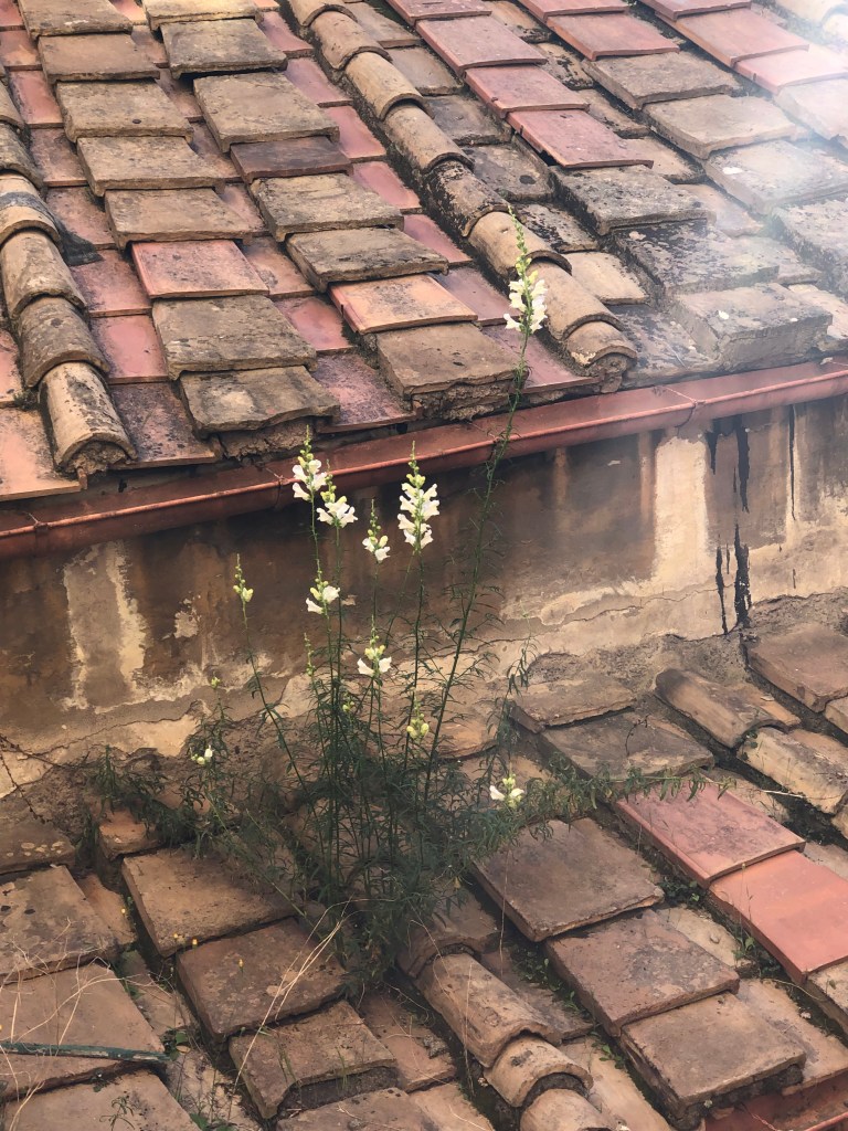 With winter now banished, one of my favorite signs of Roman spring is here — flowers sprouting from the tile rooftops. Above, my favorite, the corner of St. Ignatius Church seen from the terrace of our building, below a more modest view from my room. I’m not sure what this annual effusion of greenery means for the structural integrity of the tiles — and, I guess, I don’t really care. I find the flowers exuberant and surprising and, yes, just a tad reckless. In other words, a perfect sign of Easter.