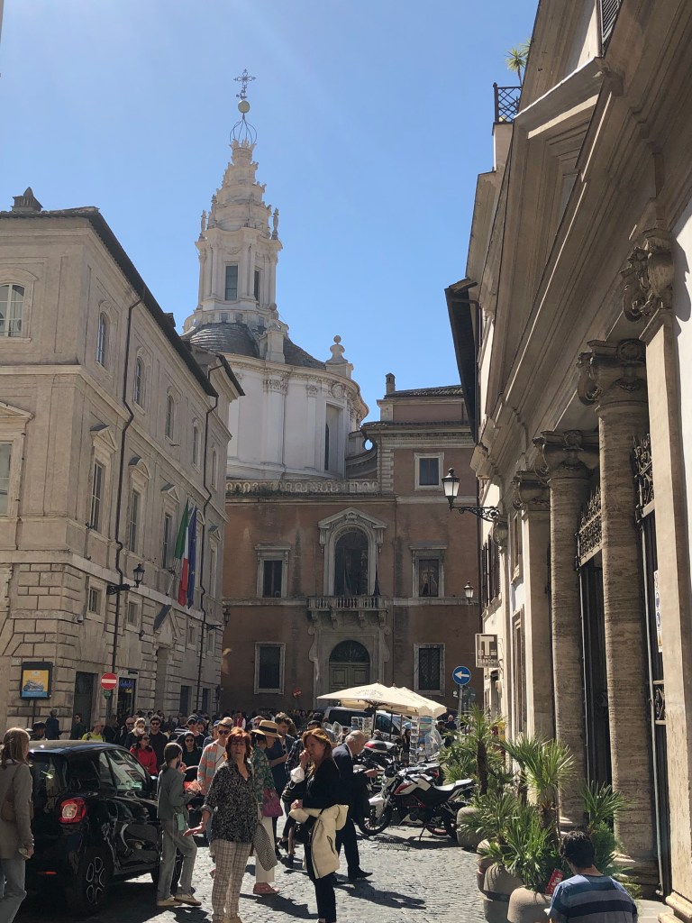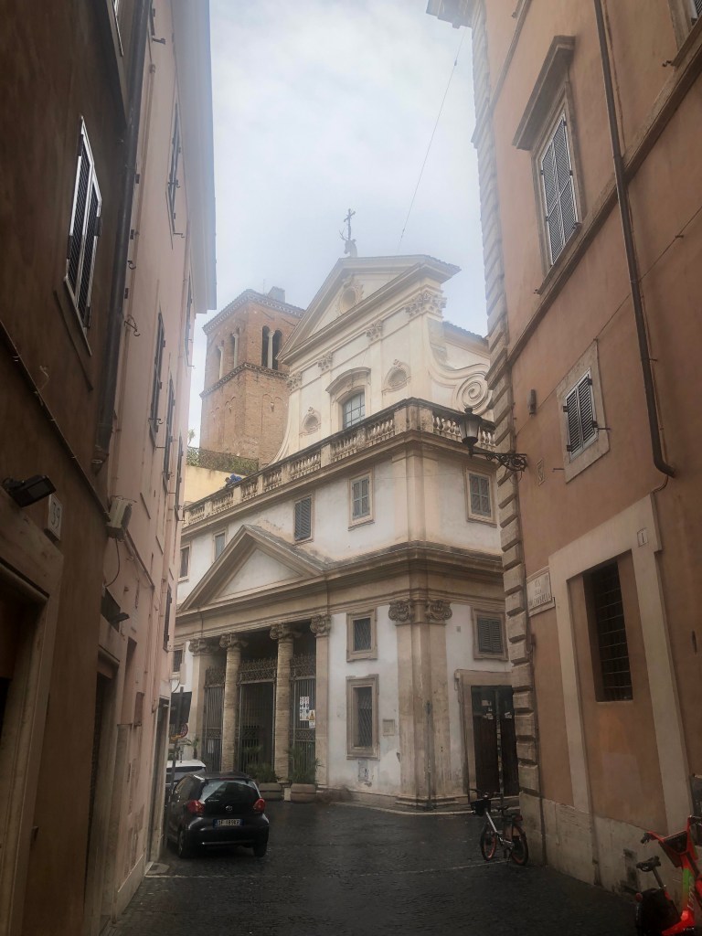 No, there is no St. Jägermeister, and the church is Sant’Eustachio (St. Eustace), named for a second century Roman soldier martyred after converting to Christianity. The conversion of Eustace, it seems, was prompted by a vision he had while out hunting. A glowing cross suddenly appeared between the antlers of the stag he was about to shoot, who then spoke to him with the voice of Christ. And, no, he hadn’t been drinking Jägermeister.