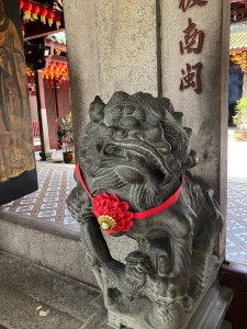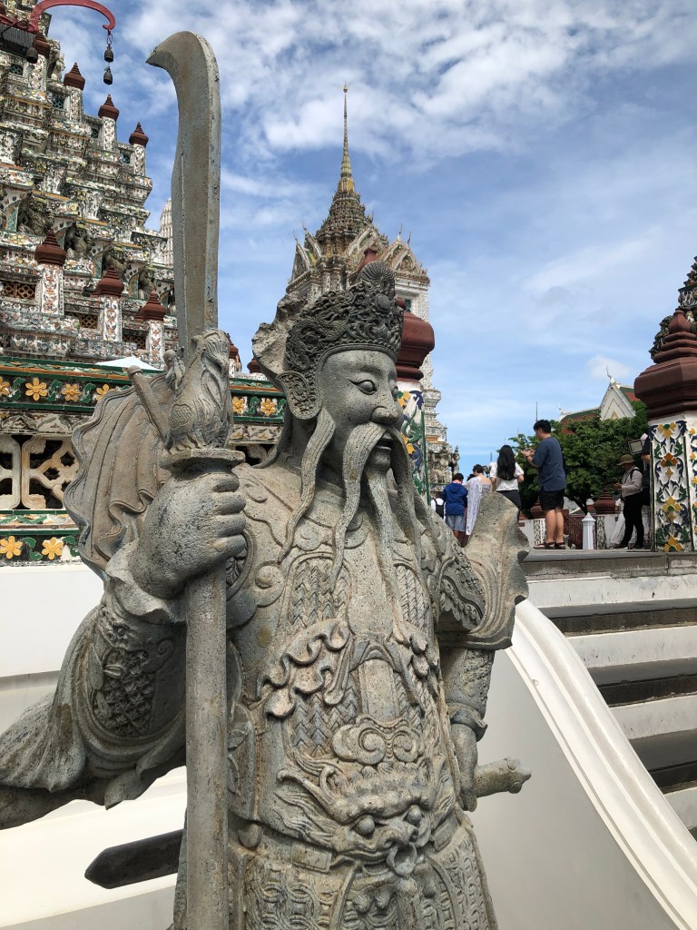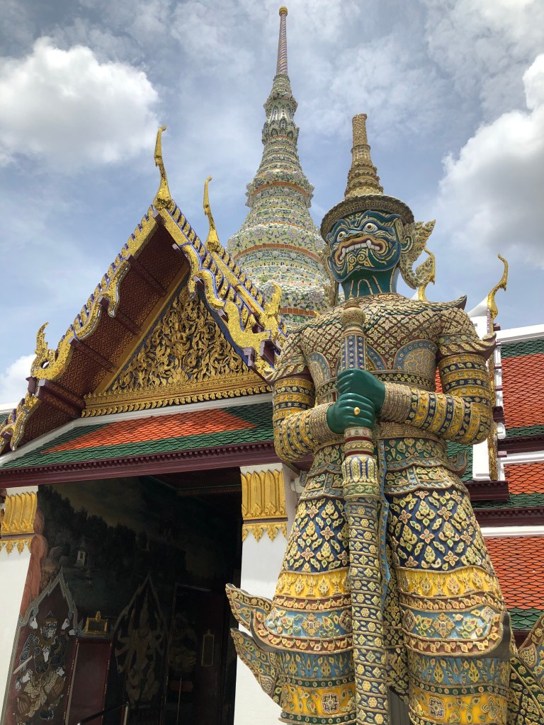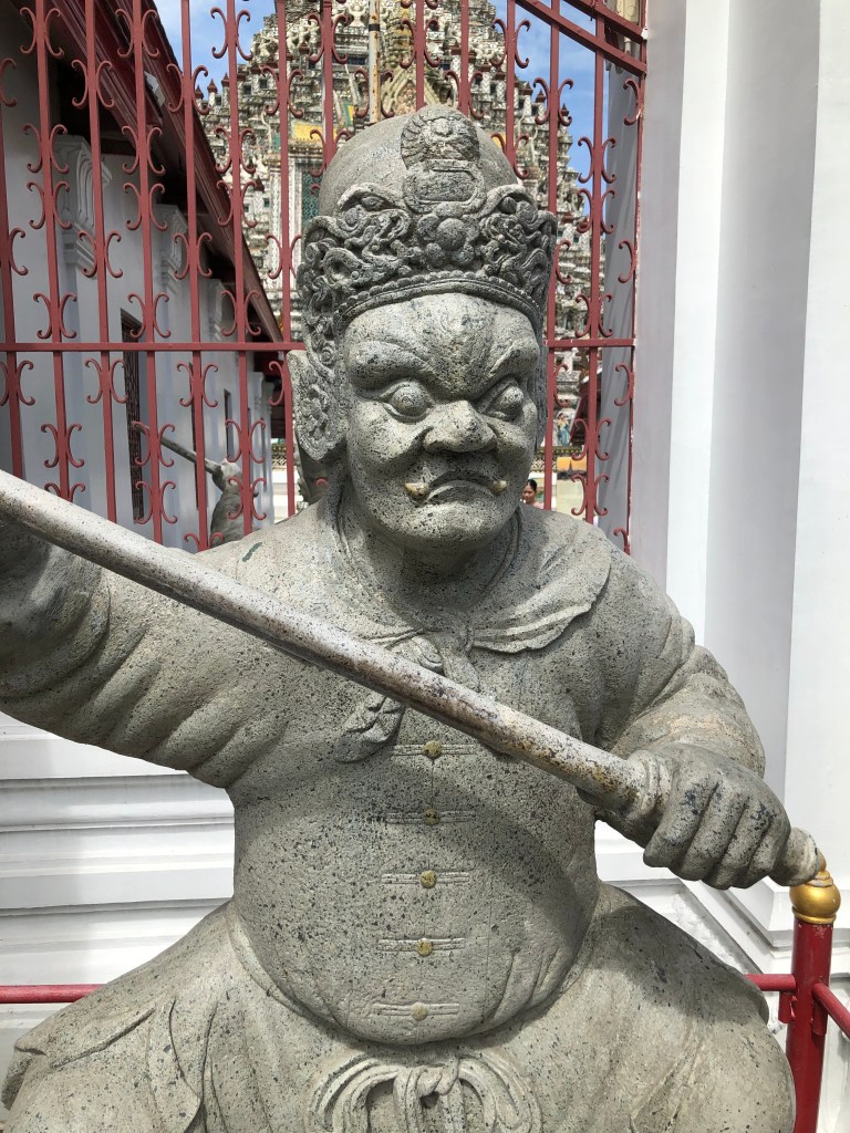 One part of the temples that I found myself repeatedly drawn to–not for any particularly elevated reason but because they were visually arresting–were the “guardians” placed outside their doors. Sometimes these were lions, sometimes warriors, sometimes dragon-like monsters. They were always fierce and fantastical. These guardians draw your attention with the same mix of fright, novelty, and whimsy that makes fantasy movies so appealing. In the royal palace in Bangkok, I was tickled that some of the warriors guarding doors were dressed up in Western military garb–what seems exotic depends on what you’re used to seeing.
