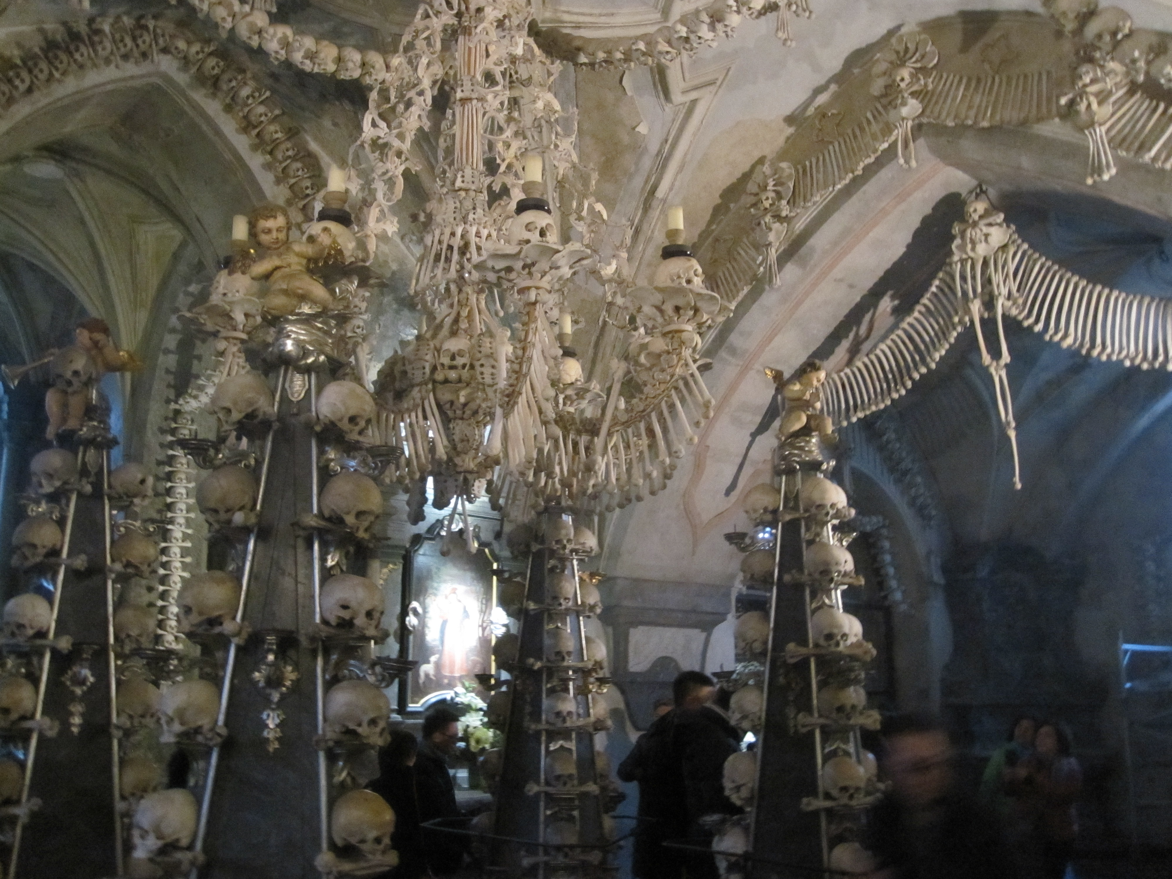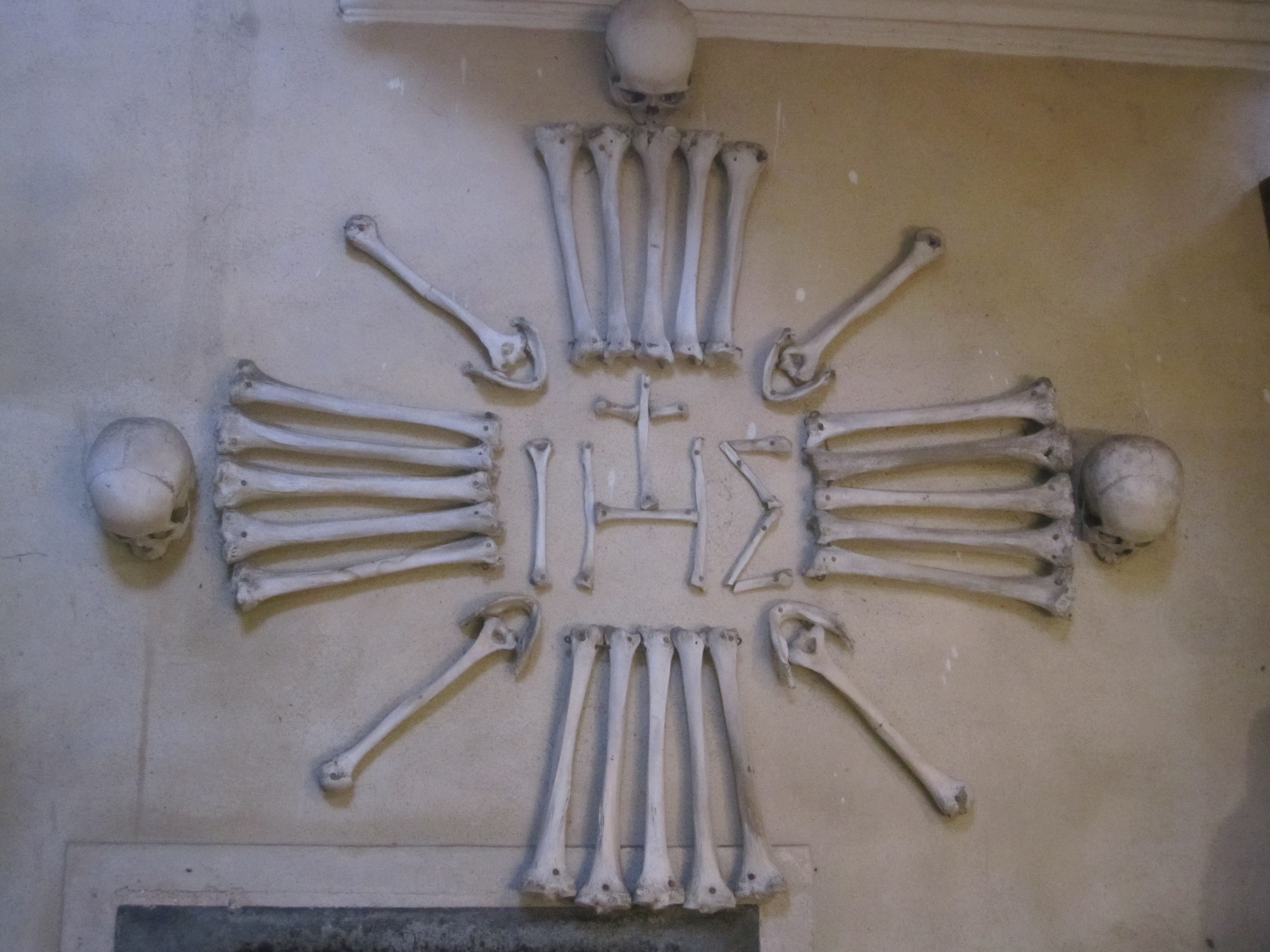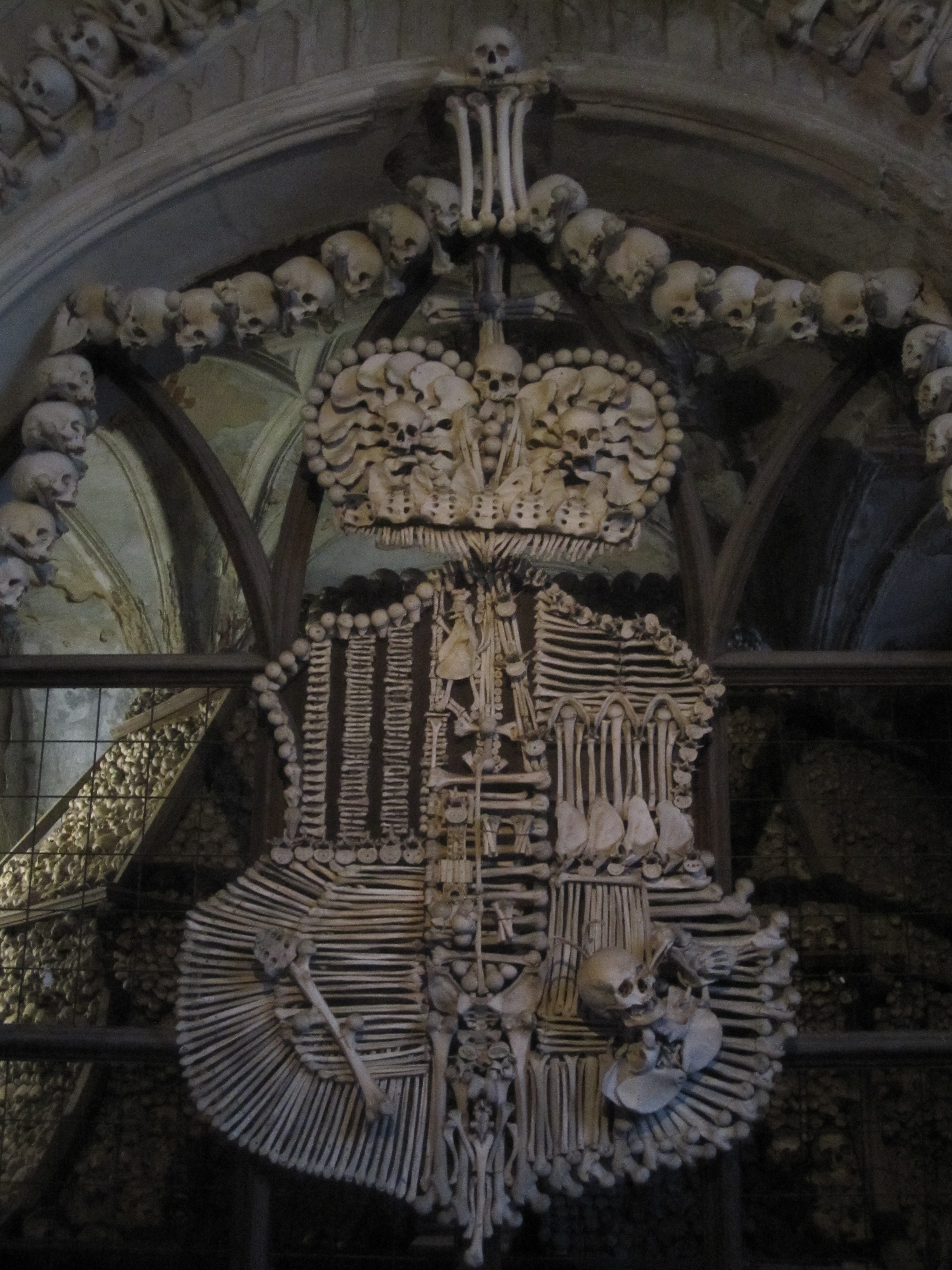 Perhaps the most striking of these monuments of mortality I’ve come across is in the small Czech town of Kutná Hora, once a rich mining center and home to a massive 18th century Jesuit college, it also houses the Sedlec Ossuary, a chapel built under All Saints Church decorated entirely with bones. The aesthetic is decidedly baroque–garlands, vases, cornices, cherubs, spires on a baldacchino, bows and ribbons. All made of human bones–jaw bones, femurs, ribs. The cherubs are playing with skulls. I can’t say it’s the interior design scheme that I’d choose.