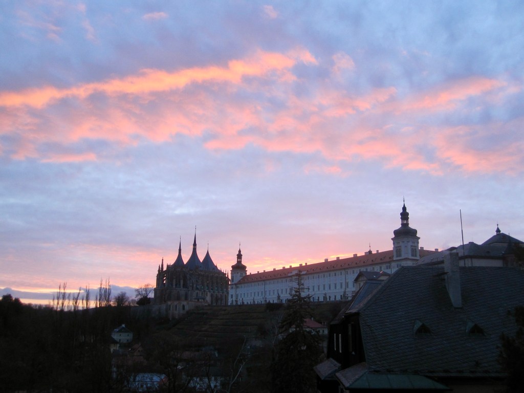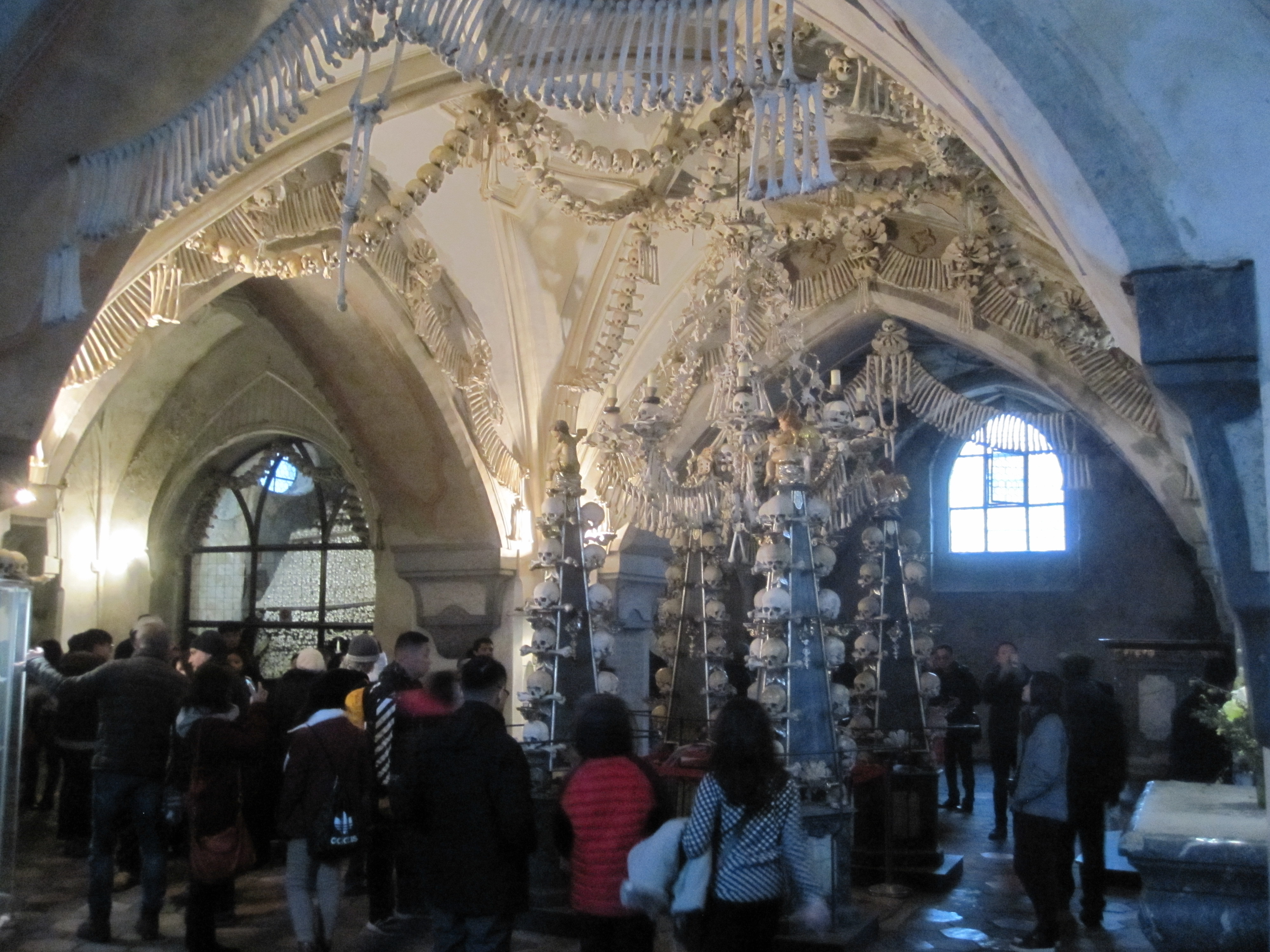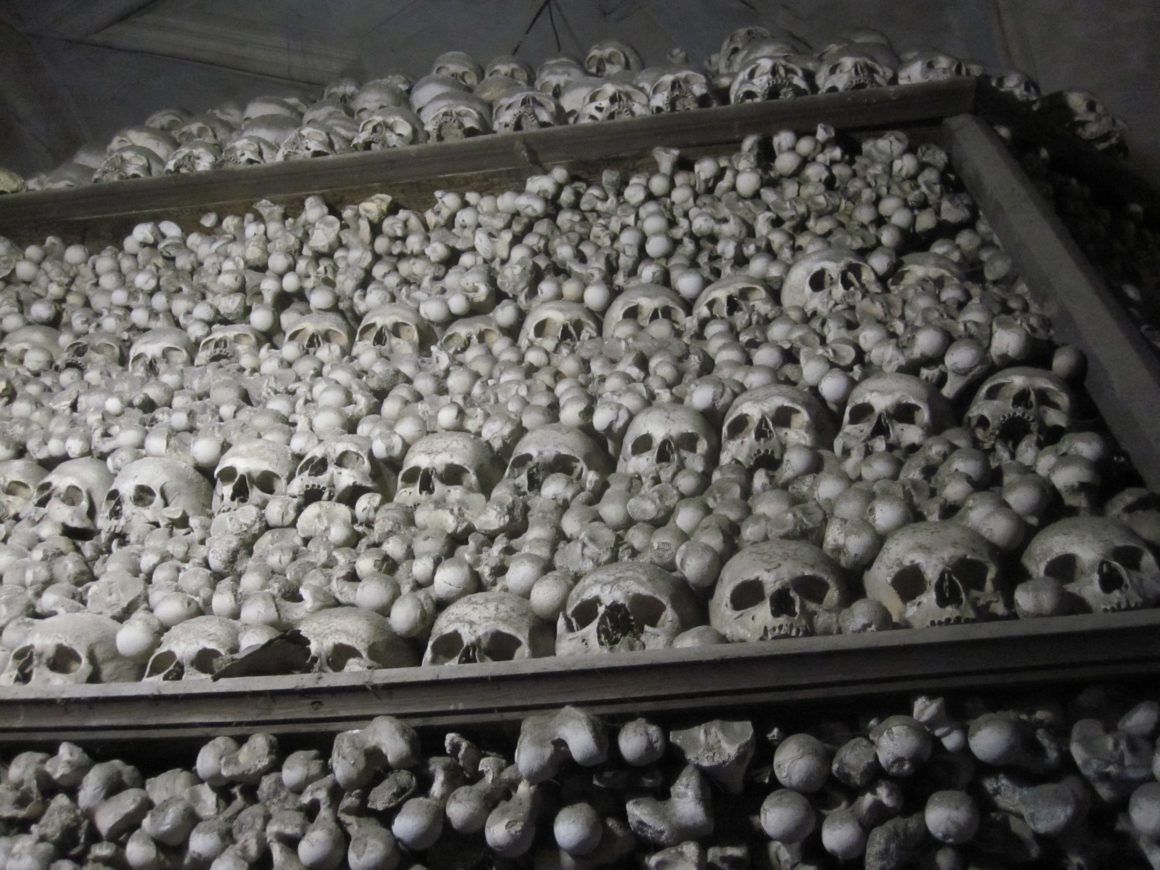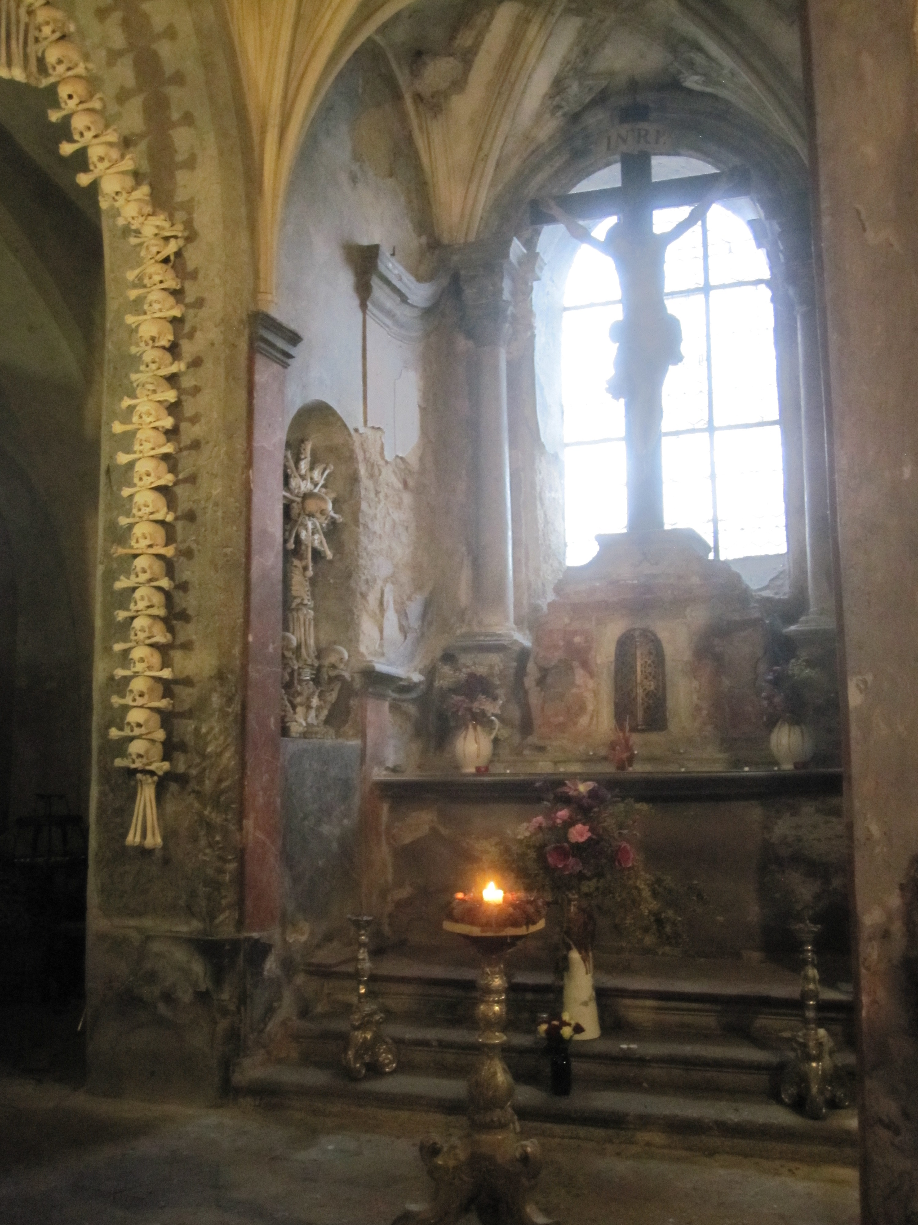 Perhaps the most striking of these monuments of mortality I’ve come across is in the small Czech town of Kutná Hora, once a rich mining center and home to a massive 18th century Jesuit college, it also houses the Sedlec Ossuary, a chapel built under All Saints Church decorated entirely with bones. The aesthetic is decidedly baroque–garlands, vases, cornices, cherubs, spires on a baldacchino, bows and ribbons. All made of human bones–jaw bones, femurs, ribs. The cherubs are playing with skulls. I can’t say it’s the interior design scheme that I’d choose.