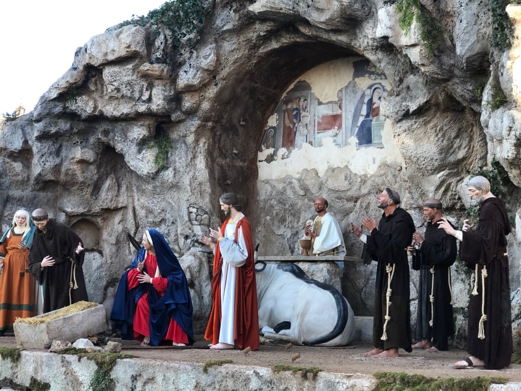 This year’s scene doesn’t aim for historical accuracy–thus, St. Francis alongside Mary and Joseph and the three friars replacing the three kings. (Oh, and there’s a priest celebrating Mass in the background too.) The fresco on the wall behind them is a replica of the one in the cave in Greccio.
