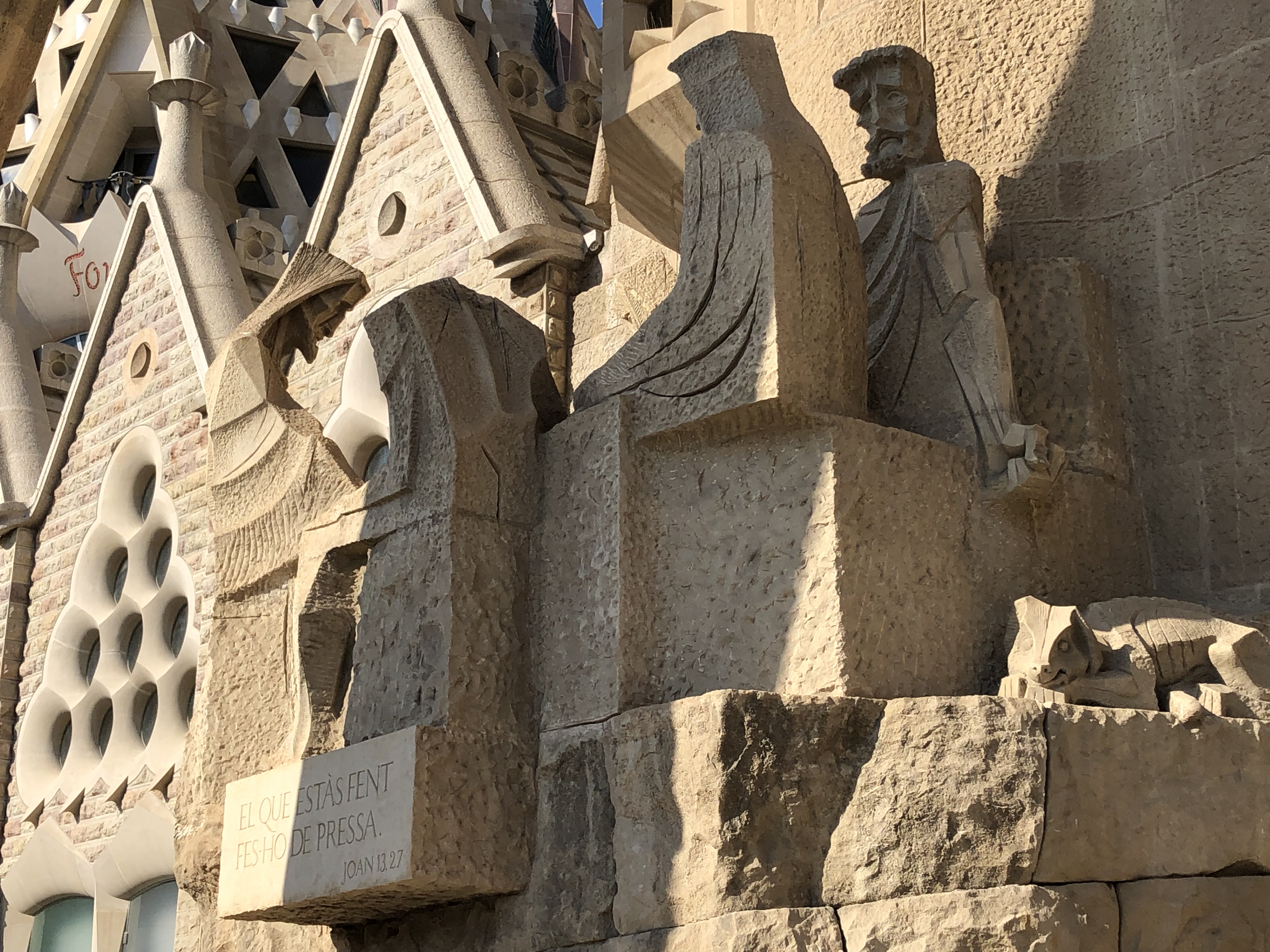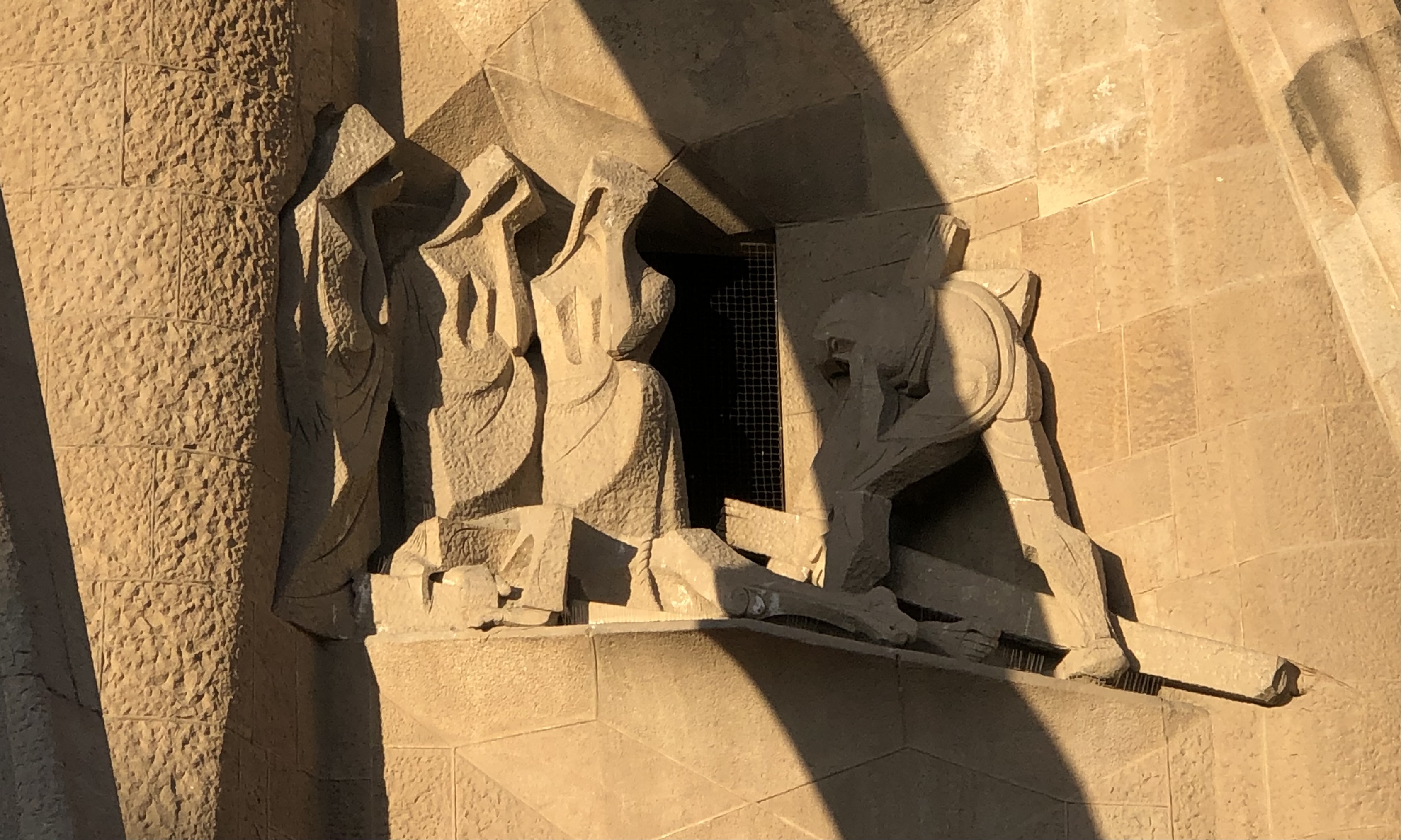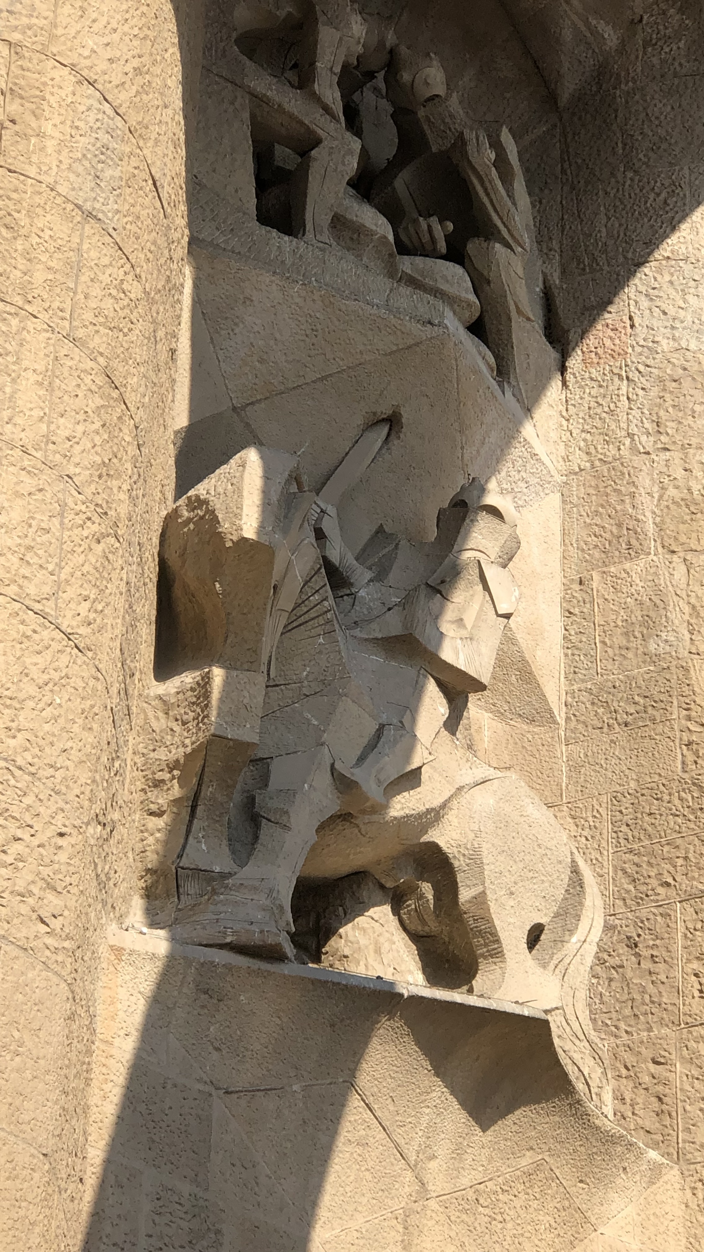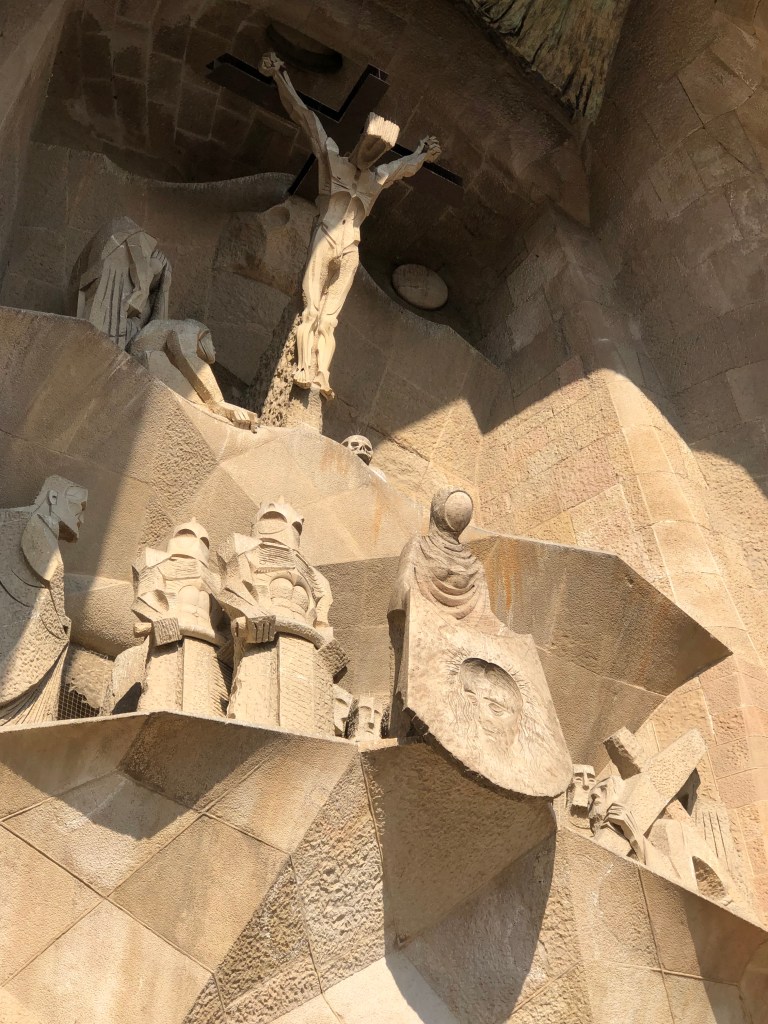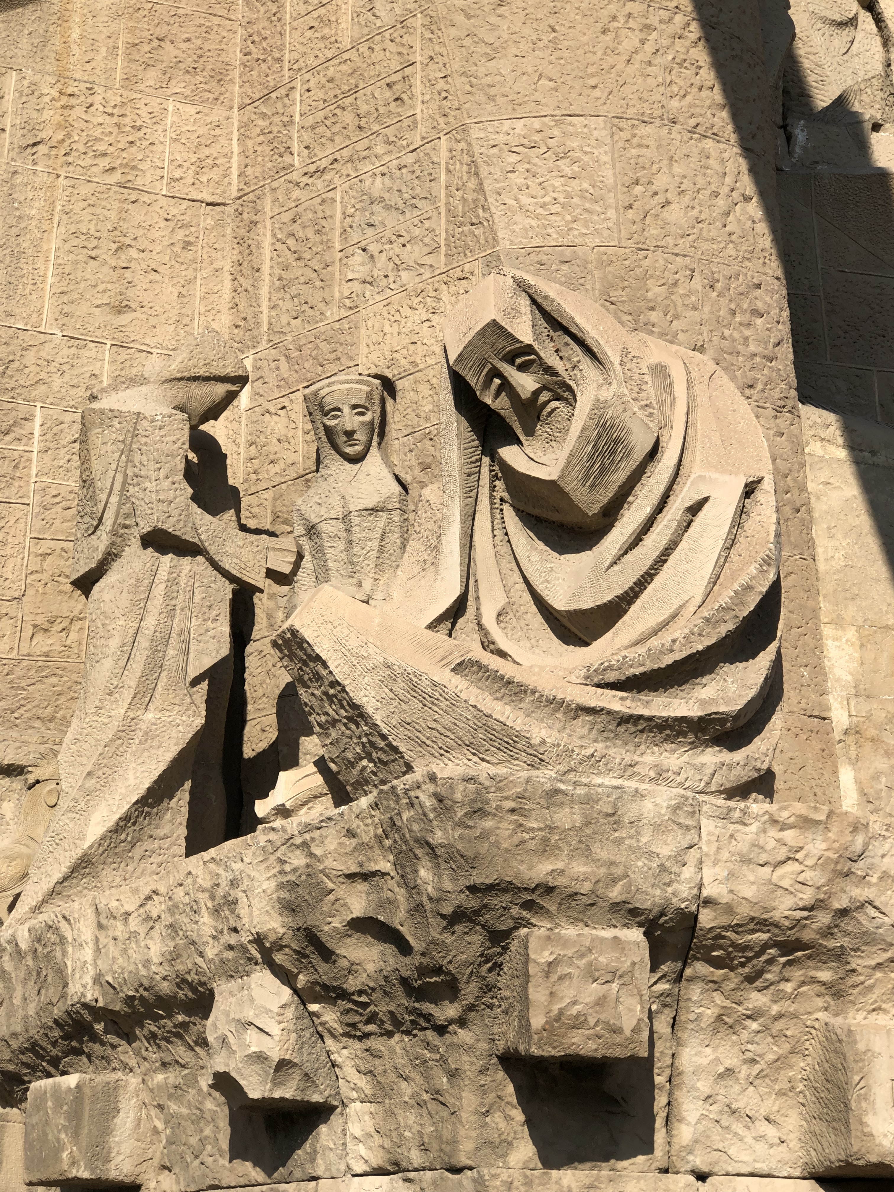 The entire basilica is a marvel, a deeply spiritual and prophetic building. This Holy Week, I thought it would be appropriate to share some photos of the Façana de la Passió, the Passion Facade. The sculptures broadly follow Gaudí’s instructions, though they are the work of Josep Maria Subirachs. If anything, the sculptures are even more harsh and austere than Gaudí’s original sketches. The hardness of the work is actually in keeping with Gaudí’s instructions.