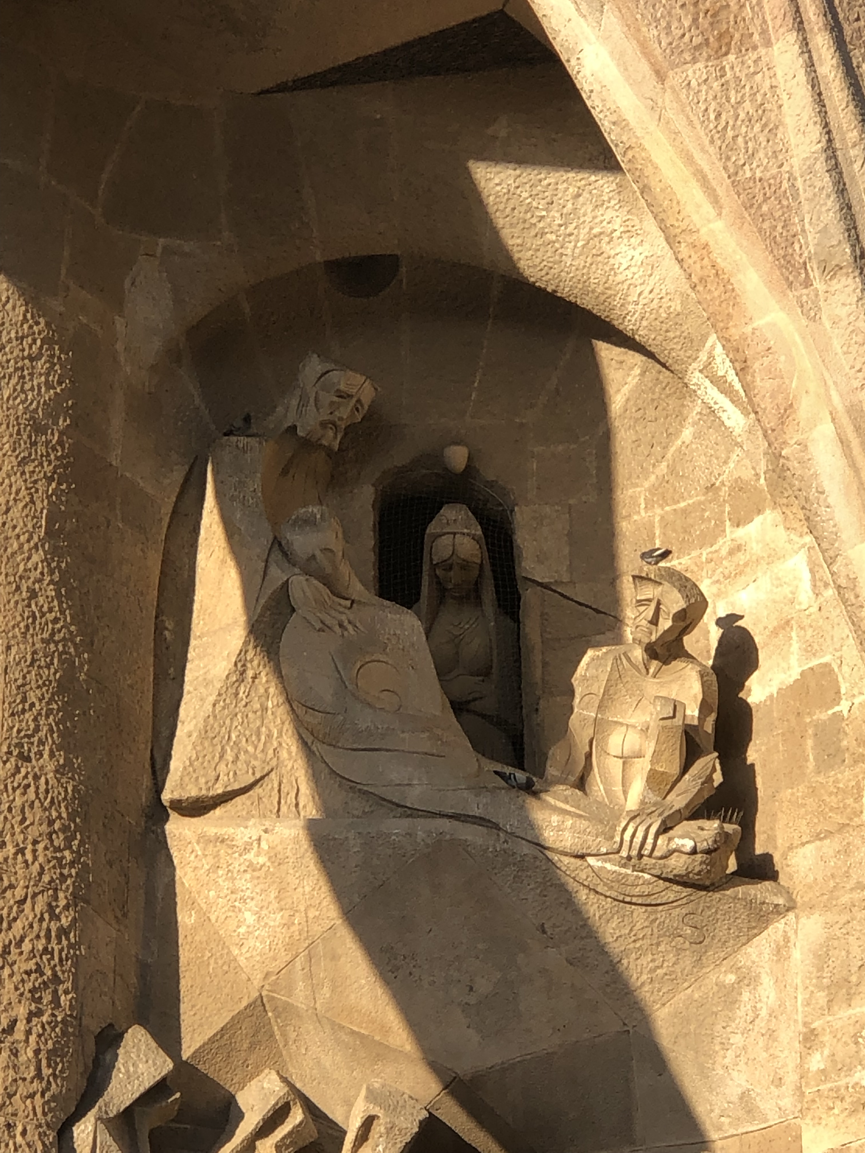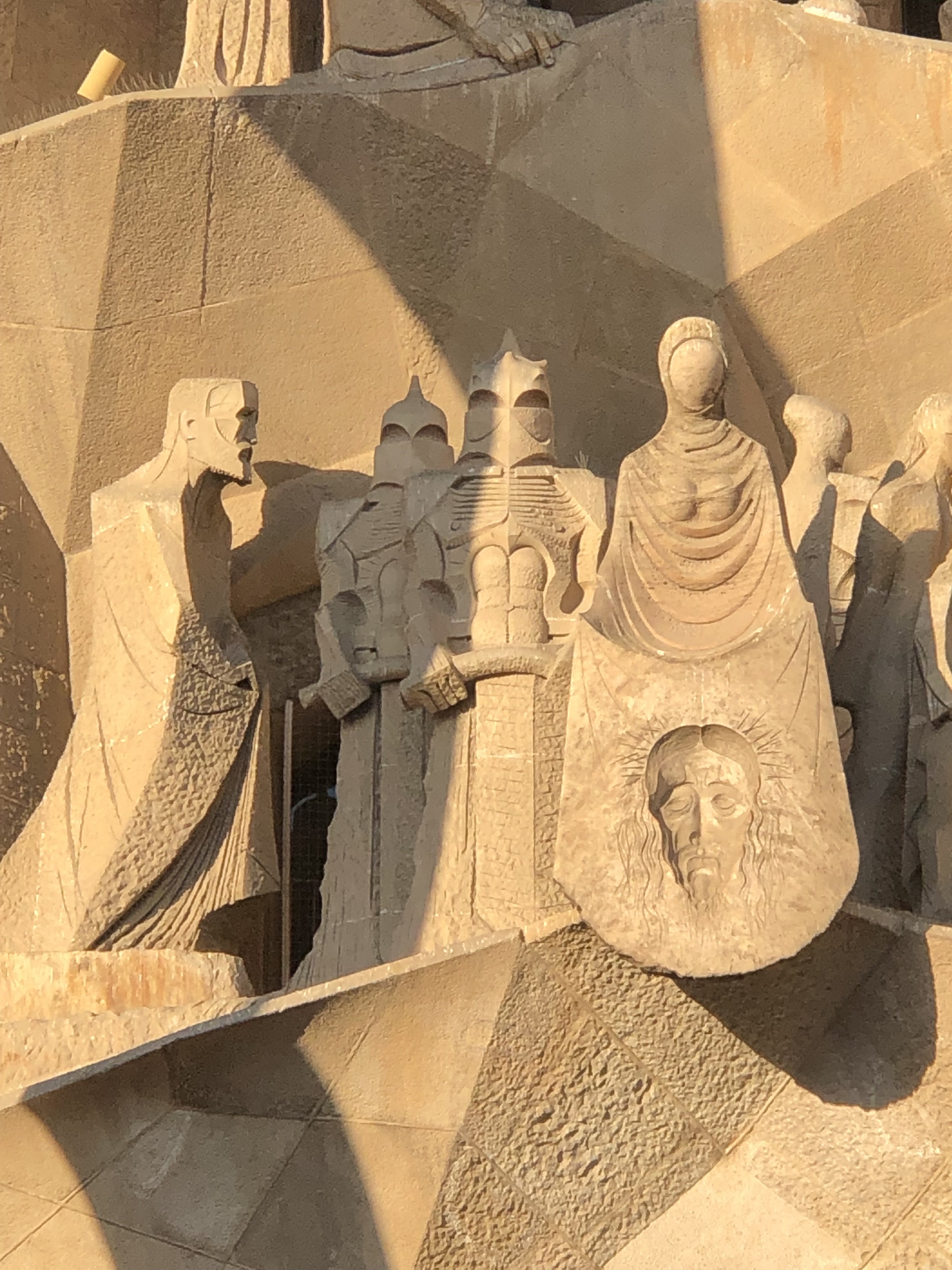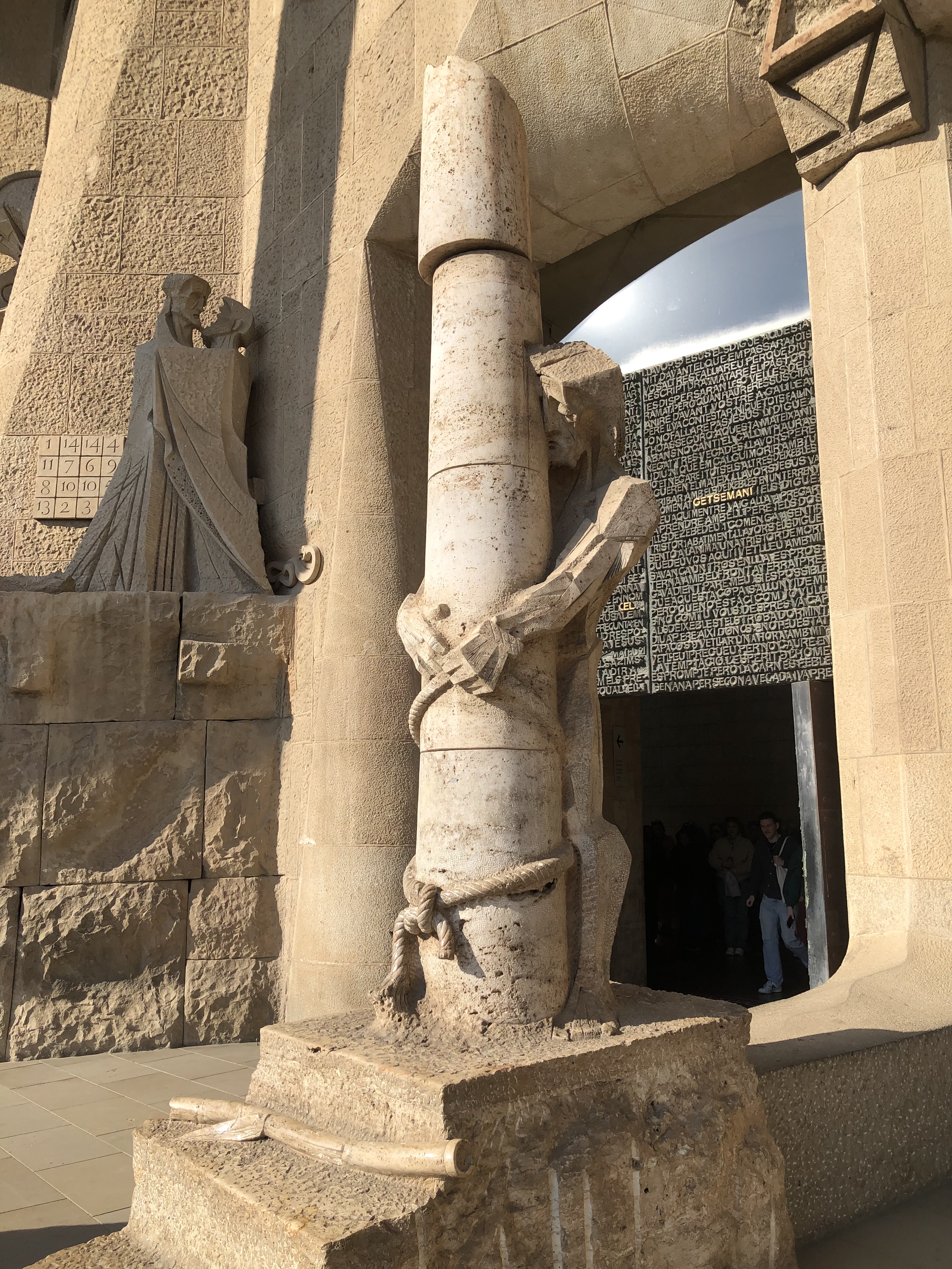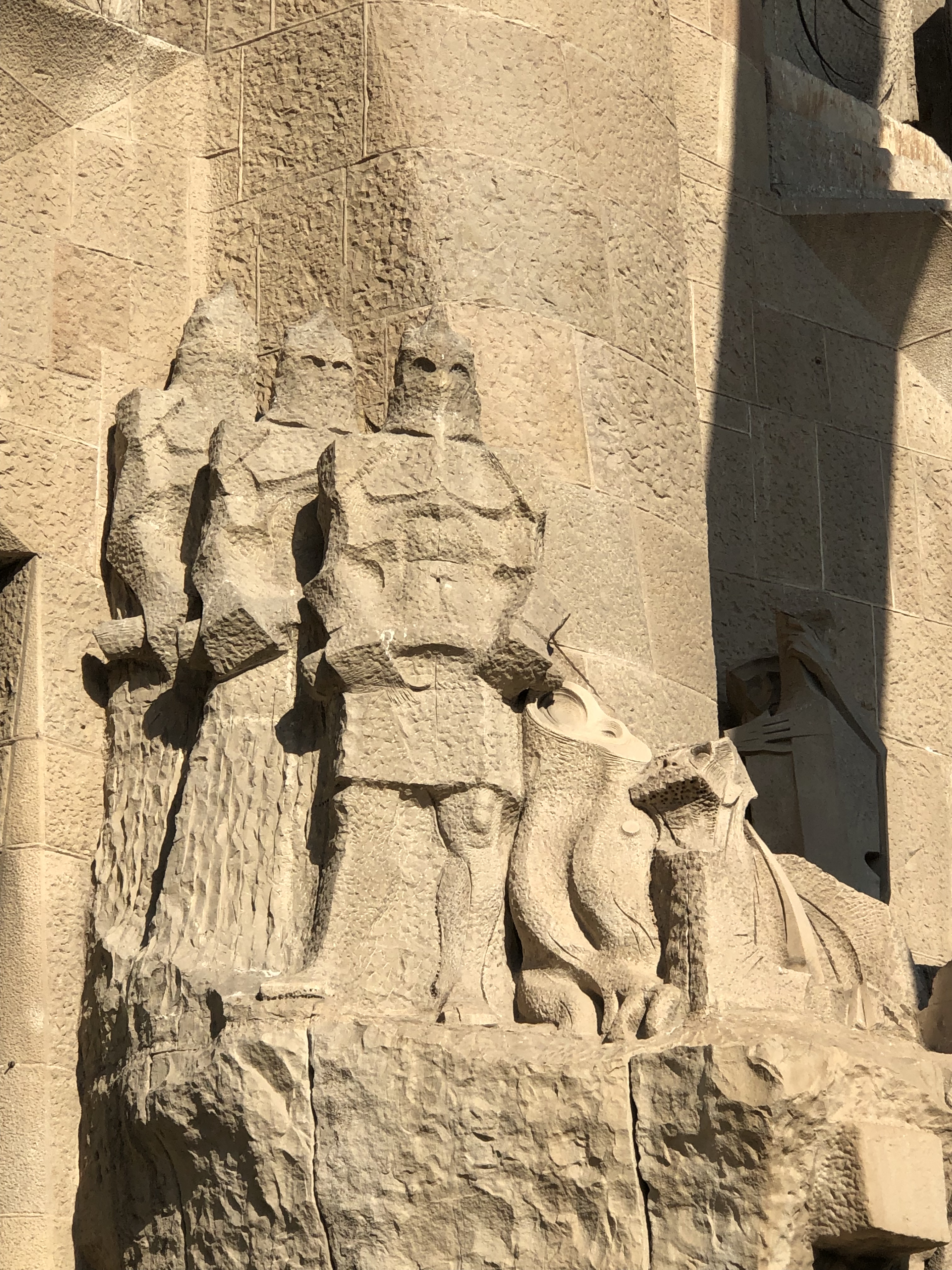The entire basilica is a marvel, a deeply spiritual and prophetic building. This Holy Week, I thought it would be appropriate to share some photos of the Façana de la Passió, the Passion Facade. The sculptures broadly follow Gaudí’s instructions, though they are the work of Josep Maria Subirachs. If anything, the sculptures are even more harsh and austere than Gaudí’s original sketches. The hardness of the work is actually in keeping with Gaudí’s instructions.